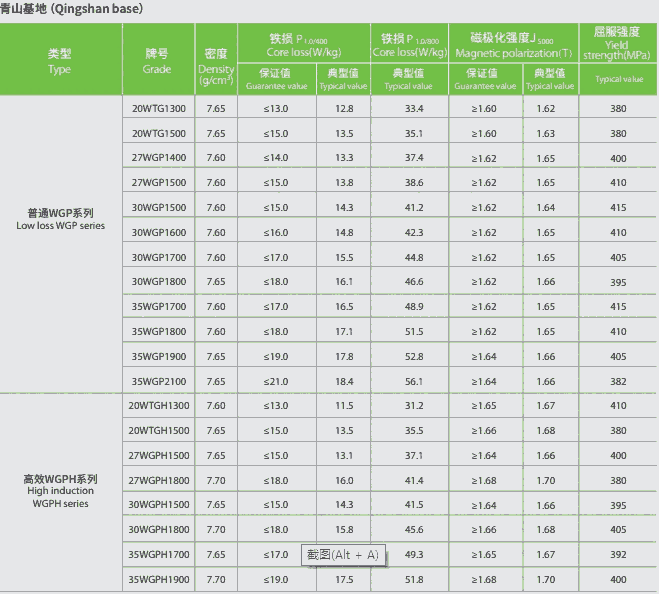 青山基地无取向硅钢20WTG1300 20WTG1500 27WGP1400 27WGP1500 30WGP1500 30WGP1600 30WGP1700 30WGP1800 35WGP1700 35WGP1800 35WGP1900 35WGP2100 20WTGH1300 20WTGH1500 27WGPH1500 27WGPH1800 30WGPH1500 30WGPH1800 35WGPH1700 35WGPH1900 35W210 35W230 35WW250 35WW270 35WW300 35WH230 35WH250 35WH270 35WH300 WHG-35 50WW250 50WW270 50WW290 50WW310 50WW350 50WW470 50WW600 50WW800 50WH310 50WH350 50WH470 50WH600 50WH800 50WW1000 50WW1300 50WH1300 J23-50 65W310 65W530 65W600 65W800 70WK340 70WK380 80WK420。