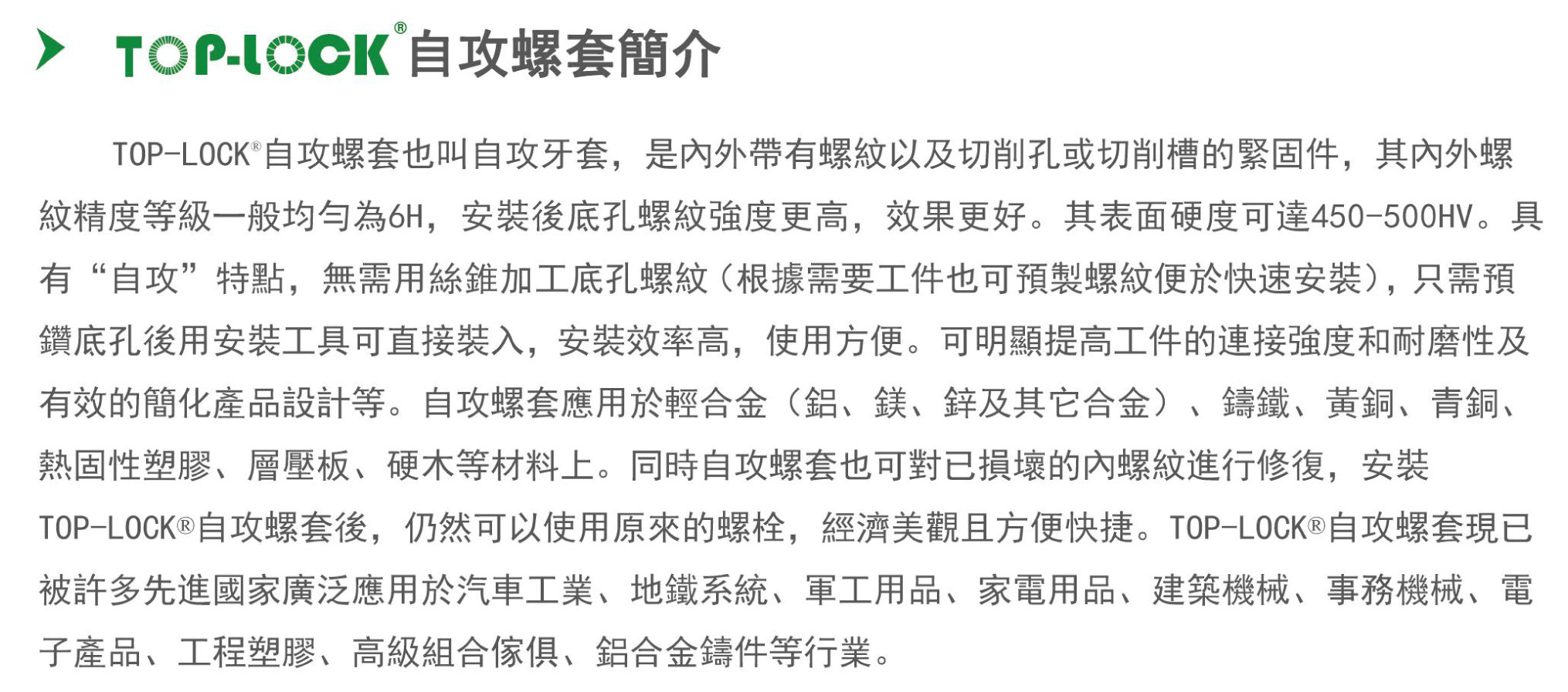 TOP-LOCK M2-M30自攻螺套 316L/304(具体价格请面议) 材质 | 不锈钢 | ||