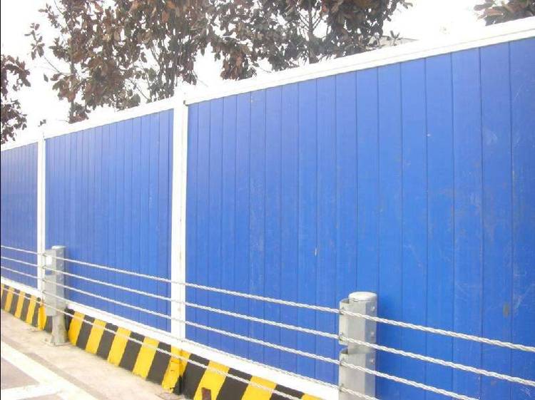 环保美观易清洗:活动围墙用白色彩钢板作墙体,用蓝色双拼C型钢作立柱,立柱顶部配蓝色造型端盖(可装路灯),围墙四周用蓝色彩钢框边。高矮、大小、色泽一致。脏污后随时可用水清洗擦拭。