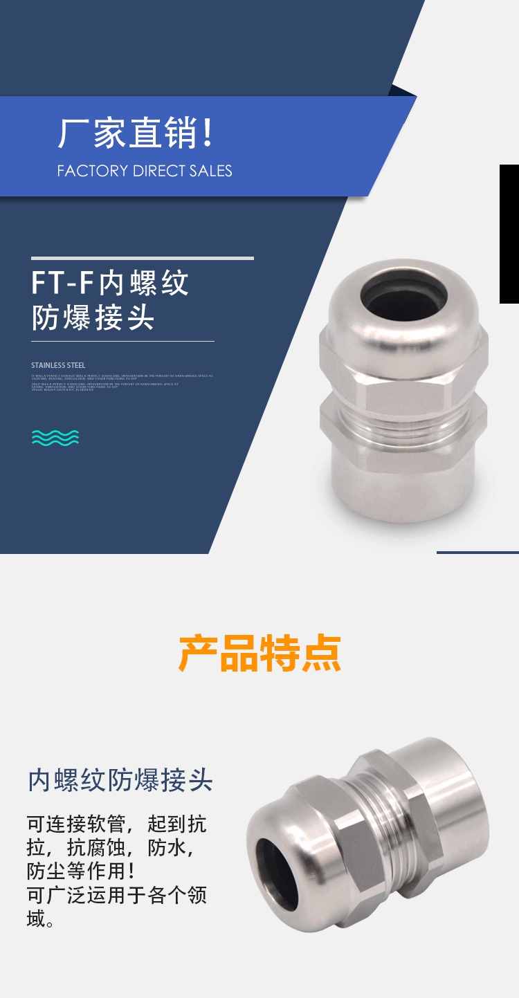 安装方法:出线口一端可将进出电缆锁紧并起到防水防尘、防震动的作用,另一端可接入设备箱体上,也可以根据选用螺纹接入进出口为内螺纹的电动设备上。