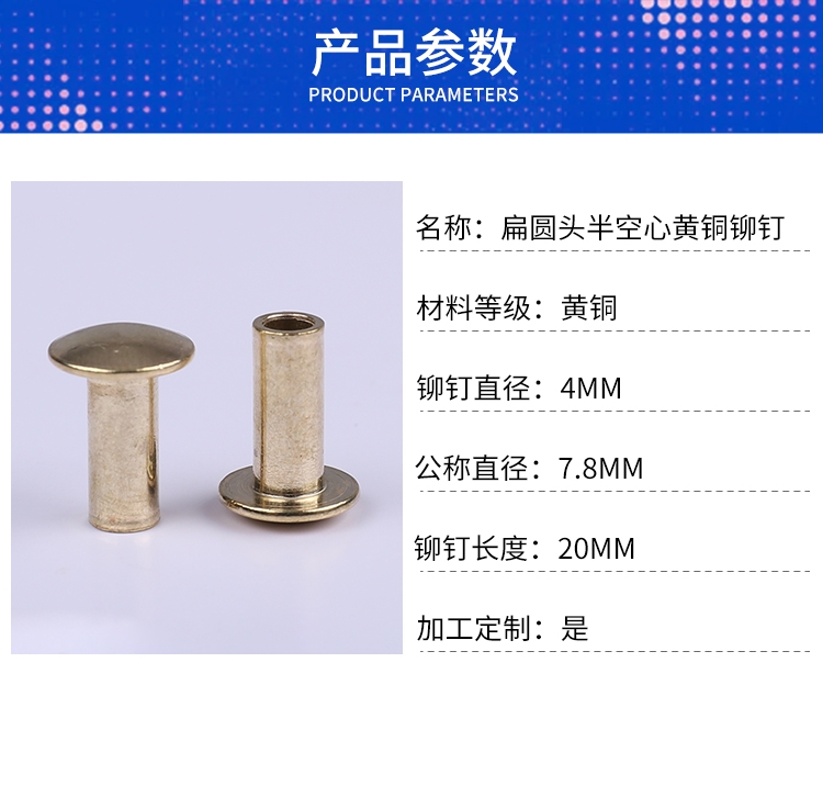 品名:       扁圆头半空心黄铜铆钉