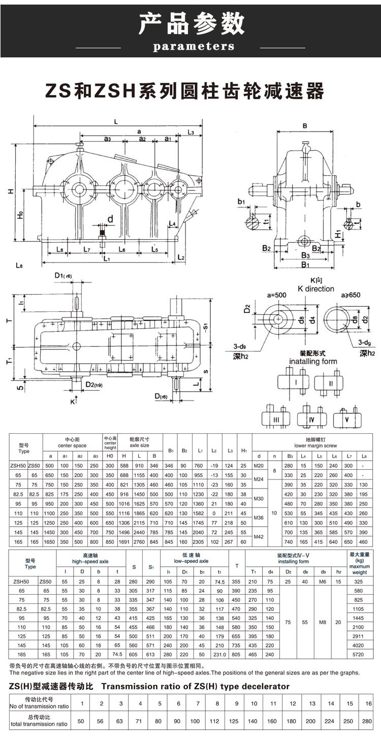 ZS145-250-II齿轮减速机,为完整型号,可正反两向运转,安装减速机时,应重视传动中心轴线对中,其误差不得大于所用联轴器的使用补偿量。且减速机需安装在坚固平整的地基上,使用前方进行空载试运转,时间不得少于2小时。运转应平稳,无冲击、振动、杂音及渗漏油现象,发现异常应及时排除。