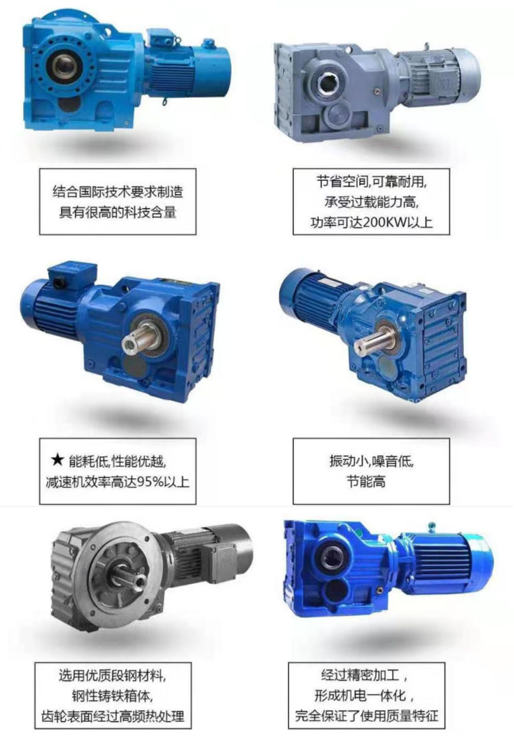KAT127-7.5KW-N21螺旋伞齿轮减速机为垂直轴结构,高速级为格里森锥齿,伞齿,弧齿,后一级为渐开线斜齿,为减速电机一体式,可根据用户配套各类动力源,普通节能电机,制动电机,防爆电机,变频电机,变频制动电机等,结构紧凑,硬齿面工艺,具有体积小、重量轻、承载能力高,效率高、使用寿命长,安装方便,所配电机功率范围广,传动比分级精细等特点。机体表面凹凸具有散热作用,吸振强,低温升,低噪音。该机密封性能好,对工作环境适应性强。该机传动精度高,特别适应在有频繁启动的场合工作,可连接各类减速机及配置各类型电机驱动,可安装在90度传动操作位置。该电机关键零部件采用了高耐磨材料,并经过特种热处理,具有加工精度高,传动平稳、体积小承载能力大、寿命长等特点。该减速机可配置各种类电机,形成了机电一体化,完全保证了产品使用质量特征。。该系列产品规格齐全,转速范围广,通用性好,适应各种安装方式,性能安全可靠寿命长.