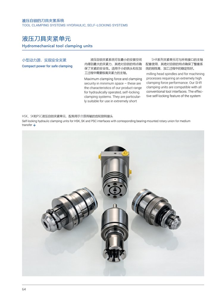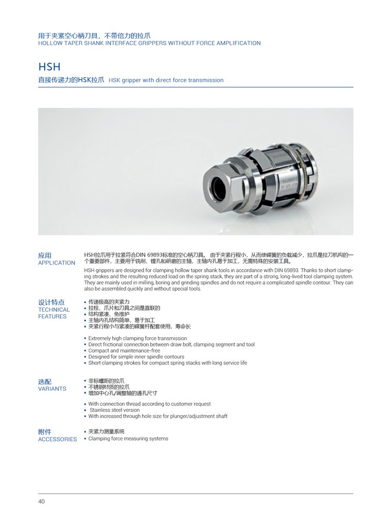 HSH(L)拉爪由一个弹簧环夹持,这样在插入和移出空心柄刀具时可以摆动,拉紧时,拉爪中心位置拉杆的锥度会加大拉刀力。拉紧螺栓用于打刀。