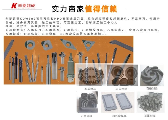 HPD涂层刀具和CDW302牌号pcd刀具适用于:石墨、石墨坩埚、石墨模具、石墨制品、复合材料、碳纤维、玻璃纤维、石墨电极、高硅铝合金、二氧化锆、牙齿(氧化锆)等难加工材料。