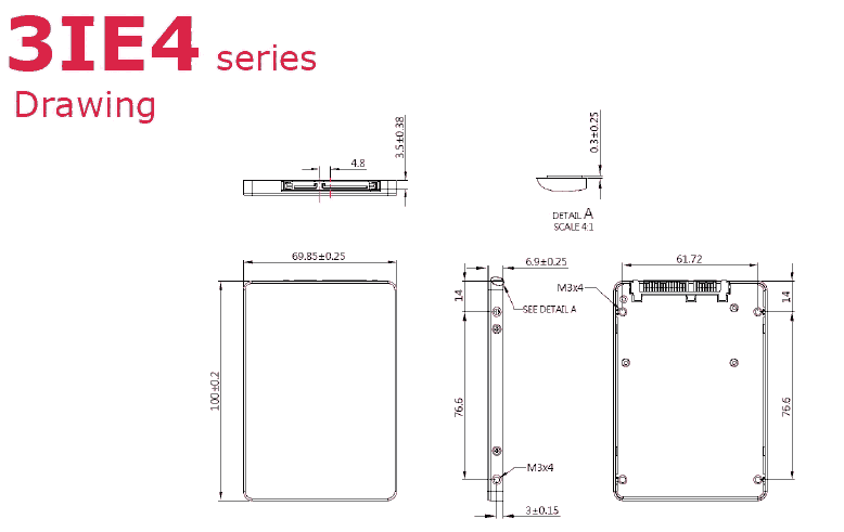 Innodisk 2.5” SATA SSD 3IE4 is characterized by L3 architecture with the latest SATA III (6.0GHz) Marvell NAND controller. Innodisk’s exclusive L3 architecture is L2 architecture multiplied LDPC (Low Density Parity Check). L2 (Long Life) architecture is a 4K mapping algorithm that reduces WAF and features a real-time wear leveling algorithm to provide high performance and prolong lifespan with exceptional reliability.