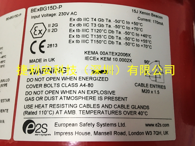 捷利安科技(深圳)有限公司长期优势供应英国E2S BEXBG15DPAC230AB1A1R/R防爆氙信号灯,保证原装产品,欢迎询价订购。