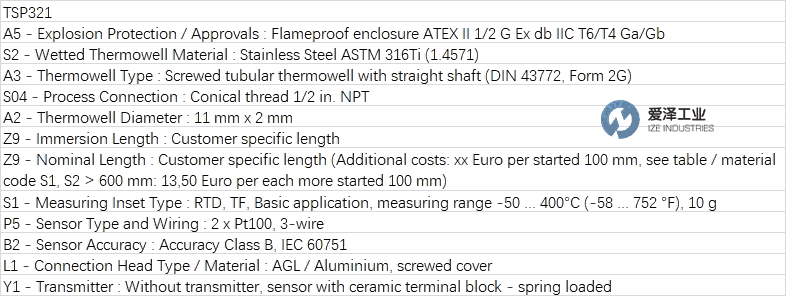 ABB温度传感器TSP321.A5.S2.A3.S04.A2.Z9.Z9.S1.P5.B2.L1.Y1规格及型号描述