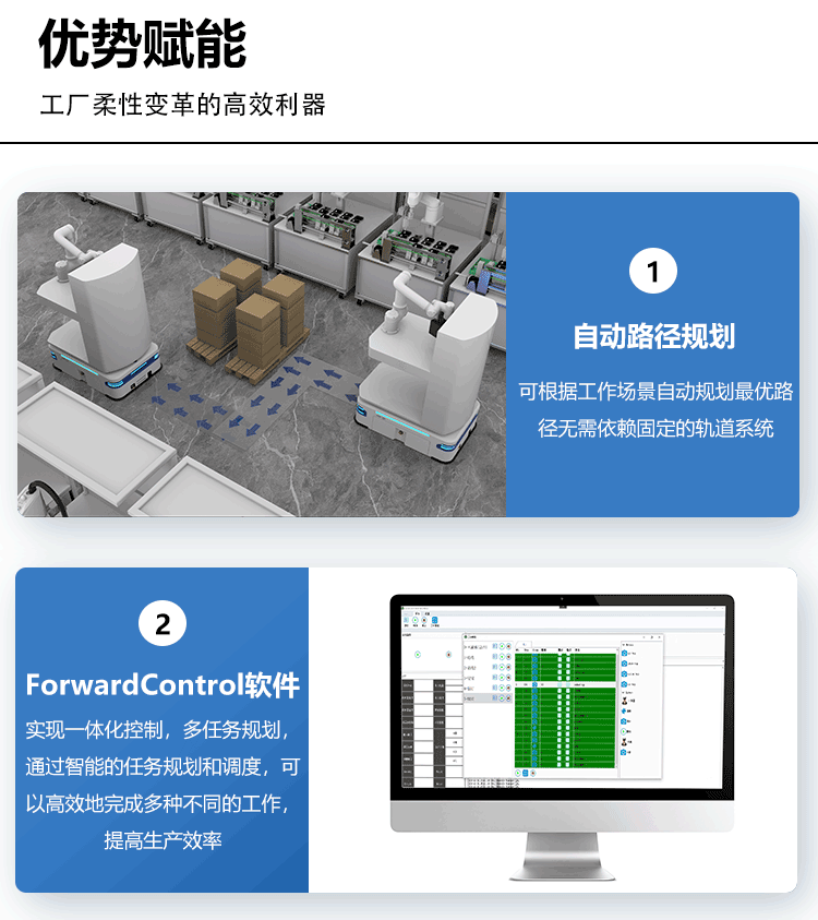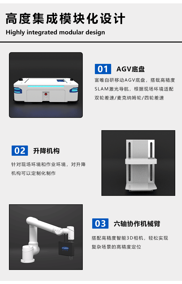 应用场景:复合机器人使得协作机器人有更广阔的作业空间,同时2D/3D视觉系统提供高精度的定位引导,可以实现不同工位物料的自动搬运、分拣、装卸等工作。广泛应用在汽车、电子、新能源、机加工、物流、食品与饮料、生命科学等行业。