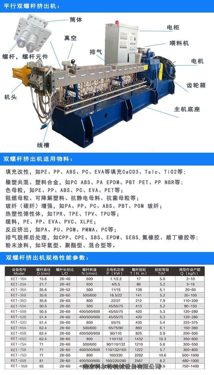 20双螺杆小型实验机,30双螺杆挤出造粒机,36双螺杆挤出造粒机,35双螺杆挤出造粒机,50双螺杆挤出造粒机,52双螺杆挤出造粒机,65双螺杆挤出造粒机,75双螺杆挤出造粒机,85双螺杆挤出造粒机,95双螺杆挤出造粒机,120机双螺杆造粒机,135双螺杆挤出造粒机
