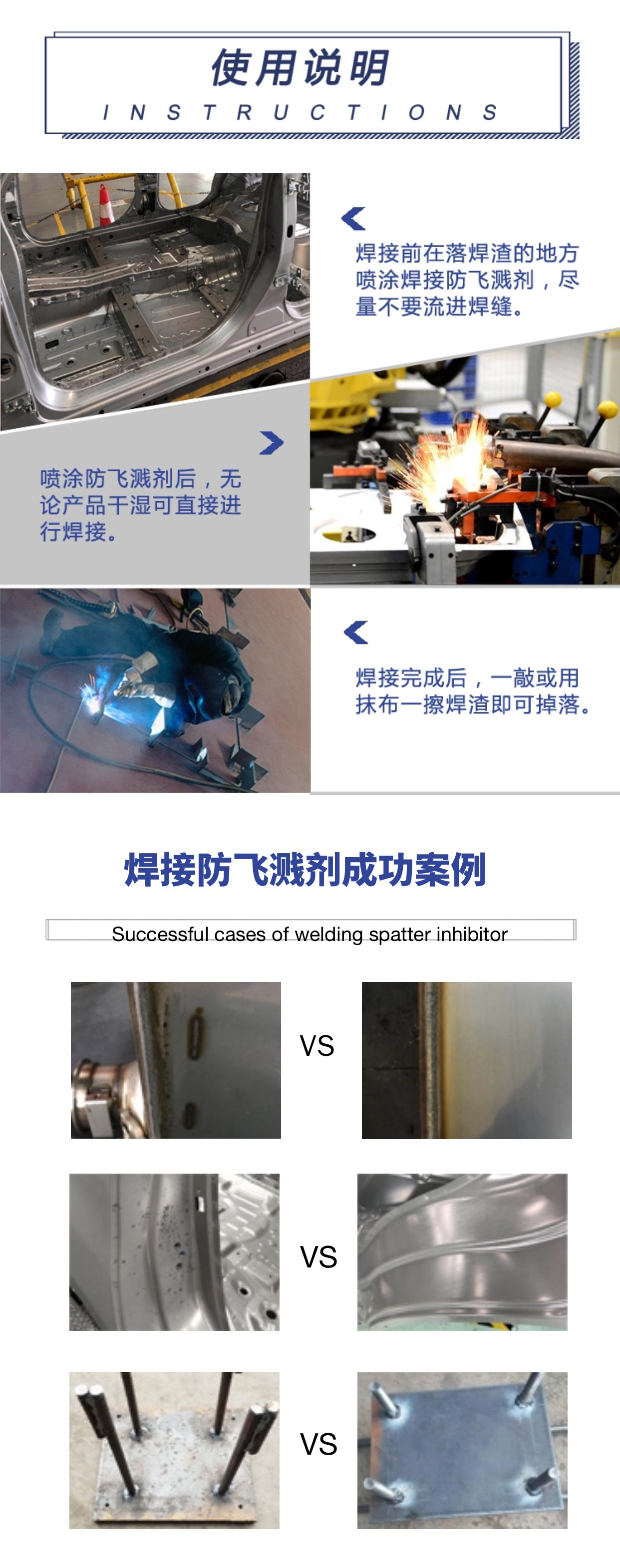 使用方法 | 焊接前,在落焊渣的地方喷上或涂上该产品,尽量不要流淌在焊缝里,无论产品干或湿都可以直接进行焊接,焊接后焊渣一敲即掉 | ||