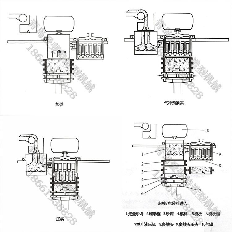 (1)多触头压实,可改善铸型背面硬度,提高铸型紧实度的均匀性及铸型的精度,型腔无疏松、搭桥,铸件无结疤、粘砂。