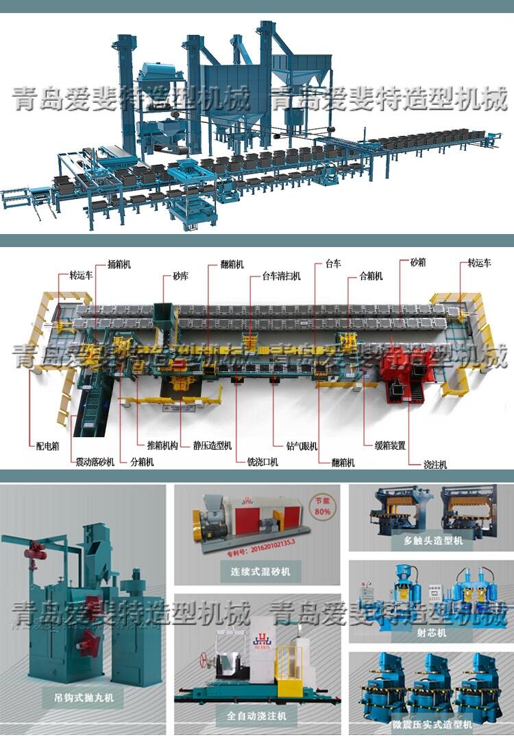 青岛爱斐特造型机械一直致力于铸造设备自动化的研发生产,铸造生产线有:全自动水平分型静压造型线,钢丸填充壳型线,呋喃树脂砂自动造型及旧砂再生系统,潮模砂处理线,消失模铸造生产线,v法铸造线;设备有-连续式混砂机、全自动造型机;经典单机微震压实式造型机、气动多触头造型机;各种冷/热芯盒射芯机;各种类型抛丸机