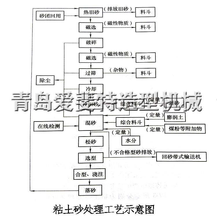 粘土湿型砂处理系统组成包括旧砂处理(破碎、磁选、筛分、烘干、冷却、再生)、储存和输送系统;新砂处理(烘干、过筛)、储存和输送系统;附加物储存和输送系统;型砂混制(包括各种物料定量加入)和输送系统;型砂质量在线监测和控制系统;机械化运输电气连锁控制系统等。
