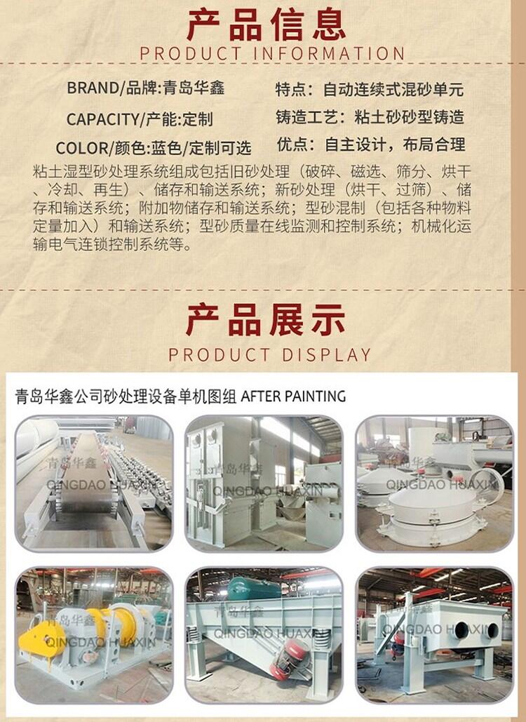qingdaohuaxin green sand treatment system consists of used sand treatment (crushing, magnetic separation, screening, drying, cooling and regeneration), storage and transportation system; New sand treatment (drying and sieving), storage and transportation system; Storage and transportation system of attachments; Molding sand mixing (including quantitative addition of various materials) and conveying system; On-line monitoring and control system of molding sand quality; Mechanized electrical interlocking control system for transportation, etc.