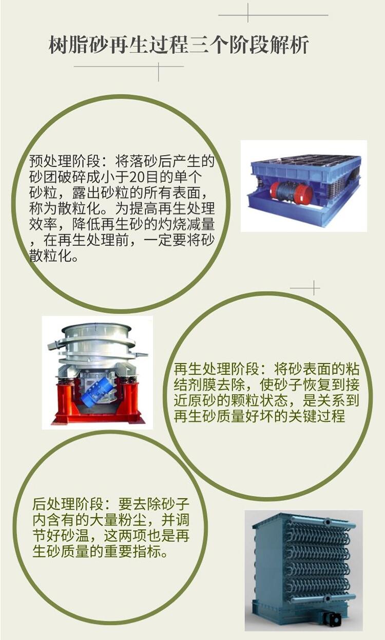树脂砂线的组成:树脂砂生产线是由磁选皮带输送机、震动破碎再生机、离心转子二次二级再生机、砂库、斗式提升机(3套)、移动双臂连续式树脂砂混砂机、脉冲反吹式除尘器等设备组成的。