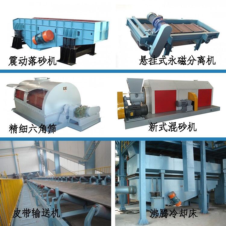 粘土砂线上的主要单机介绍:落砂滚筒、破碎机、磁选机、精细六角筛、沸腾冷却床、再生机、圆盘给料机、斗式提升机、皮带输送机、混砂机等。