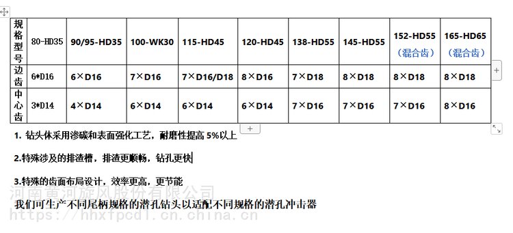 ?金刚石复合潜孔钻头还可以采用边齿(保径、凿岩齿)用金刚石复合球齿、中心齿(掘进破岩齿)用金刚石复合锥形齿、金刚石复合抛物线齿的复合布齿形式,可达到在多种类型岩石下快速凿岩的目的。