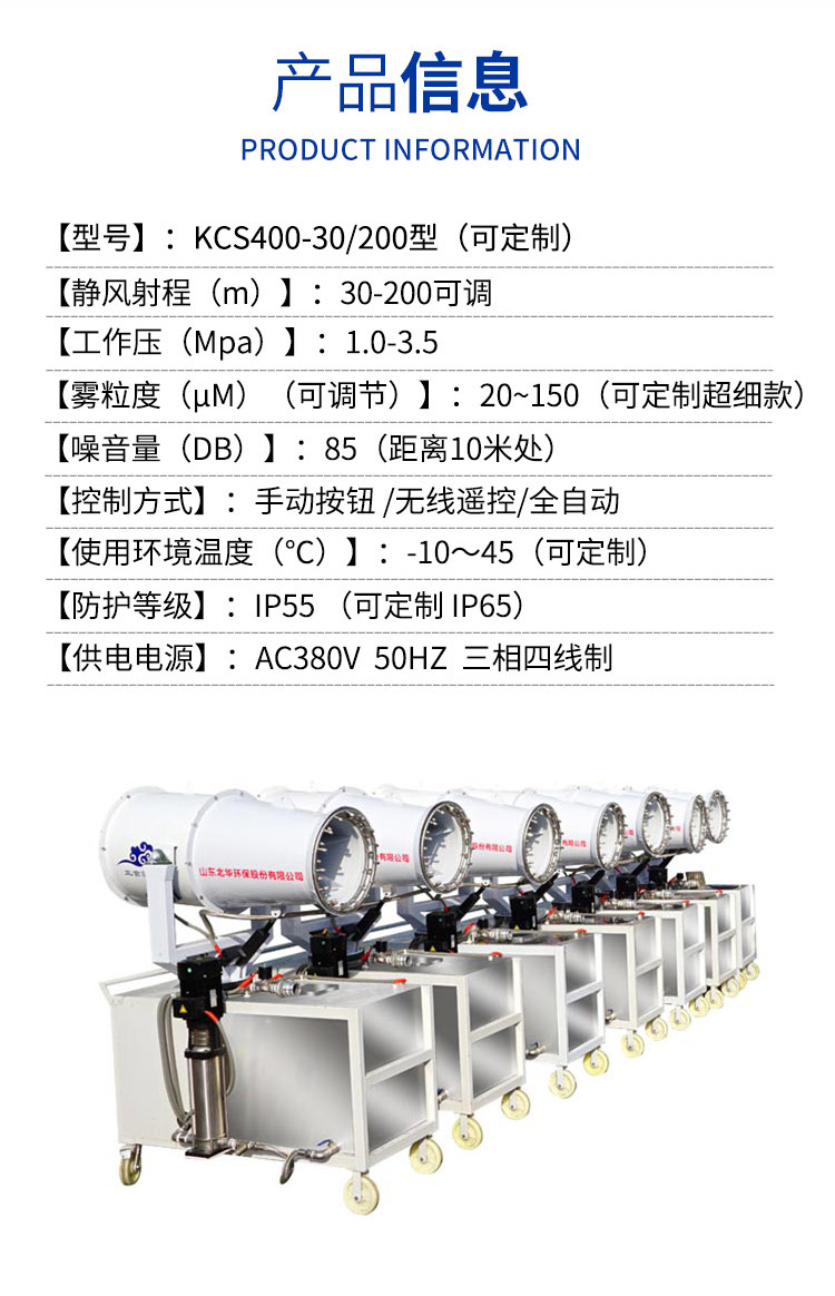 雾粒度(μm)(可调节) | 20~150(可定制超细款)(可定制干雾雾炮)(可定制双流体雾炮) | ||