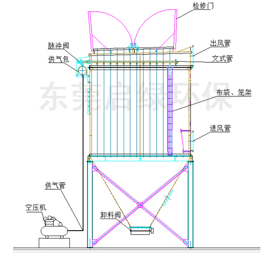 启绿环保生产的脉冲布袋除尘设备虽然整体外观看起来并不复杂,但实际上其内部构造十分精细且严谨。主要包括以下几个关键部分: