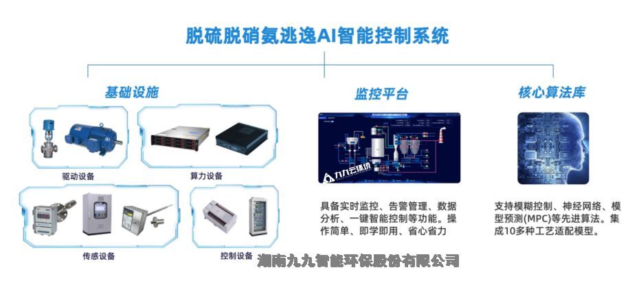 ??九九智能环保依托物联网、人工智能、大数据等前沿技术手段,自主研发了脱硫脱硝氨逃逸AI智能控制系统。通过数据采集、特征提取和数据分析等步骤,AI系统能够实时监测烟气中的温度、压力、NOx和SO?浓度,并根据这些数据动态调整脱硫剂量和喷氨量。该系统将人工智能与工业机理深度融合,打造“监测-预测-优化-控制”闭环,实现污染物(SO2、NOX、氨逃逸)动态精准管控,确保排放达标,降本增效。