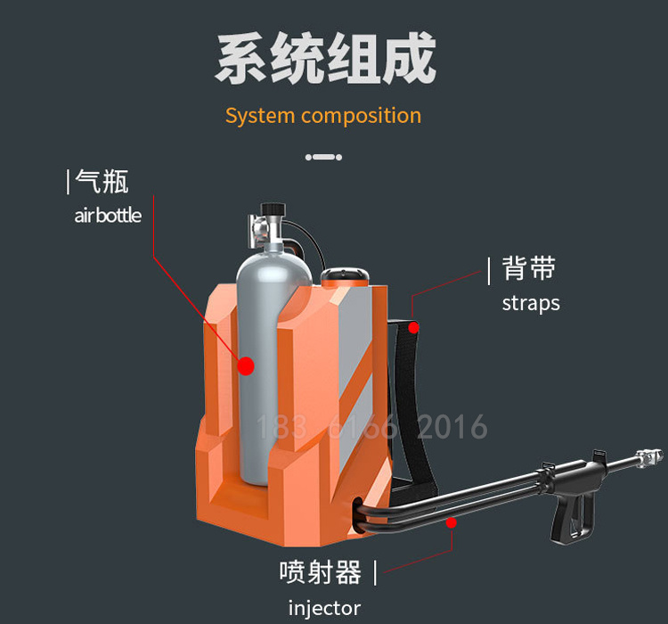 MPB18背负式泡沫灭火装置是采用以复合气瓶贮存的压缩空气为动力源,进行灭火和空气呼吸器使用;
