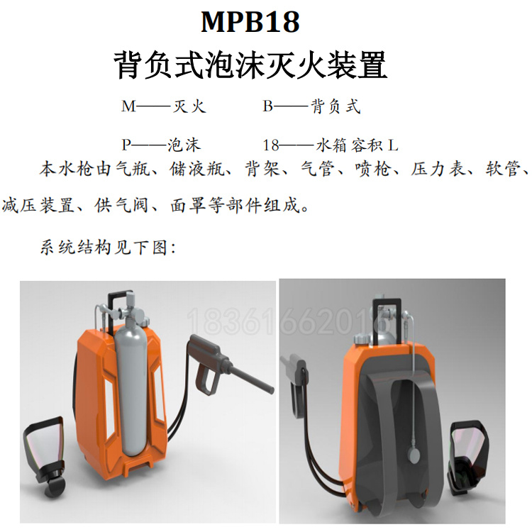MPB18背负式泡沫灭火装置是采用以复合气瓶贮存的压缩空气为动力源,进行灭火和空气呼吸器使用;