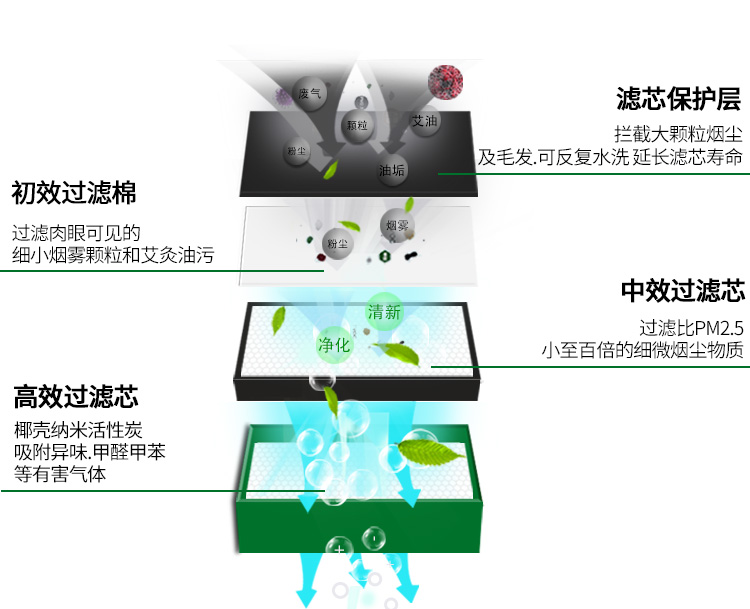 机器采用多层过滤装置,废气自上而下进气, 逐层过滤。确保有害烟雾被滤除得更彻底。滤芯模块化设计,各层过滤芯均可单独更换,滤芯使用寿命更长,更换成本更低。