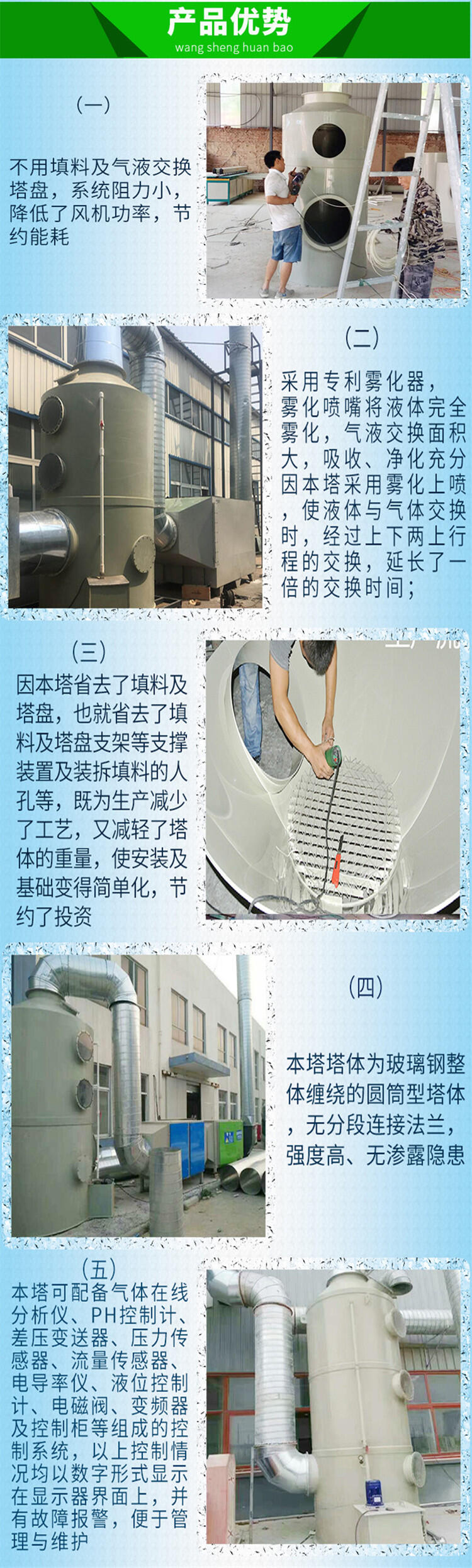 简单、能耗低、净化和适用范围广的特征,能有用去掉、水性气体,元润环保设备有限公司酸雾废气由风管引进净化塔,经过填料层,废气吸收液停止气液两相充分触摸吸收中和反响,酸雾废气经过净化后,再经除雾板脱水除雾后由风机排入。吸收