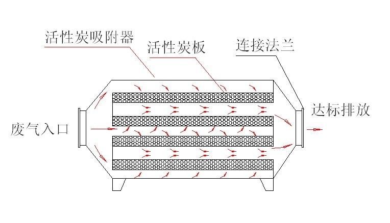 有机废气经收集后,在风机负压作用下进入活性炭吸附设备。活性炭吸附是利用活性炭的多孔性,存在吸引力的原理而开发的。