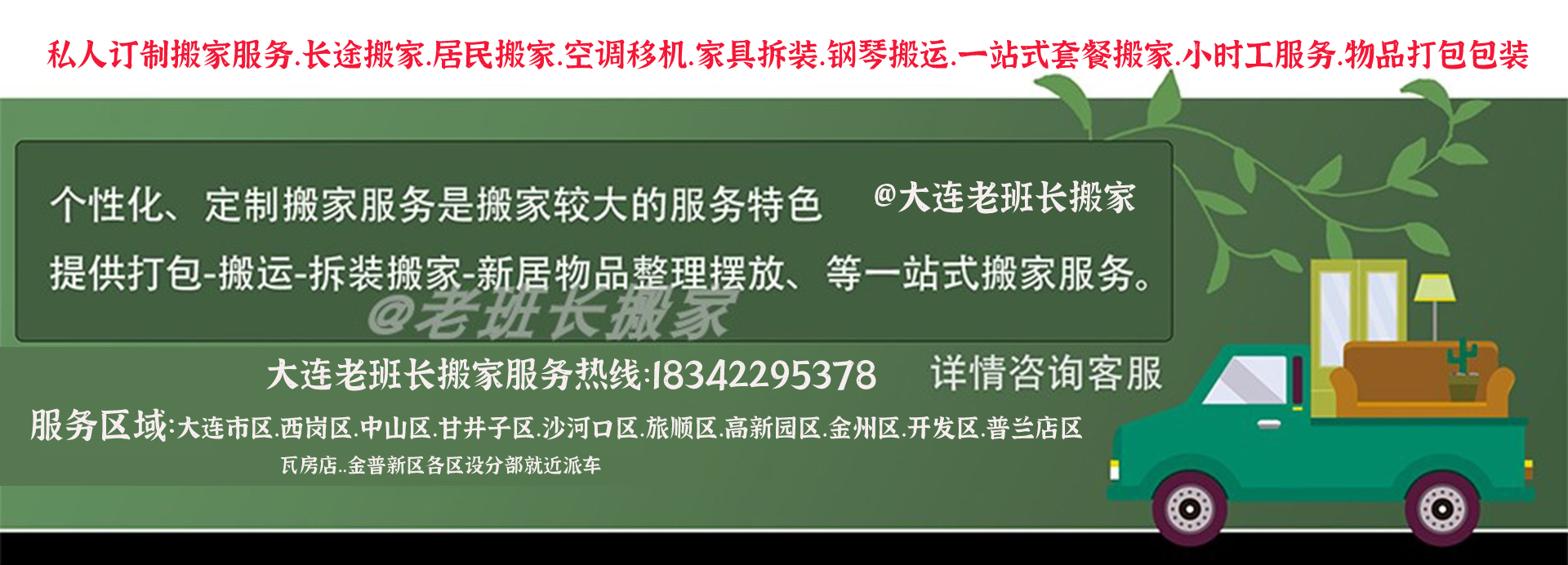 大连老班长搬家服务24小时营业:18342295378一站式高端搬家服务.中山区搬家公司、开发区搬家公司、西岗区搬家公司、甘井子区搬家公司、沙河口区搬家公司、高新园区搬家公司、金州区搬家公司、普兰店搬家公司.旅顺区搬家公司.集居民搬家、办公室搬迁、搬家货运、长短途运输、临时仓储、物品包装、拆装家具、计时工服务、钢琴搬运、重型设备迁移、空调移机