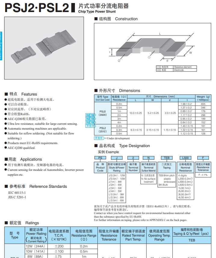 PSJ2NTEB1L00F低阻值片式功率分流电阻器