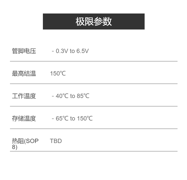 管脚电压 | -0.3V to 6.5V | ||