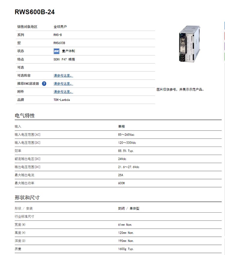TDK-Lambda AC-DC电源 RWS600B-24特性