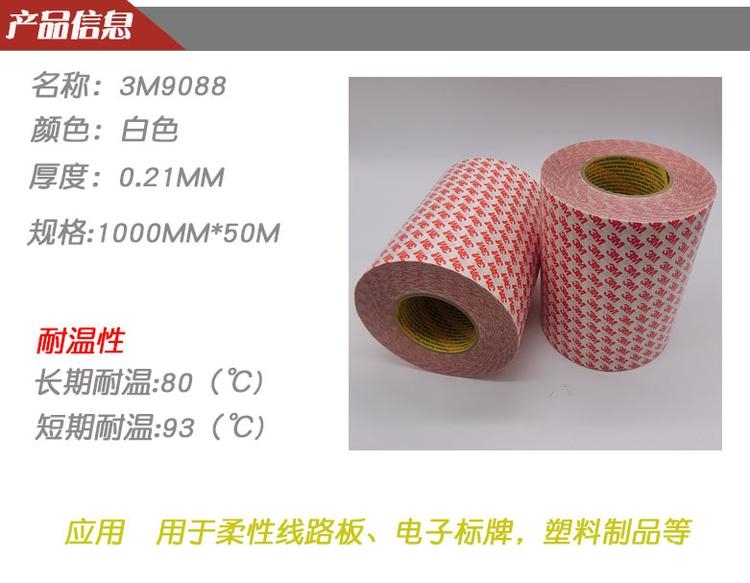 应 用:3M9088双面胶在环保方面符合ROHS法规要求,粘性加工,对塑胶、橡胶、铭牌均有良好的粘性;耐高温双面胶带长期耐温93℃,短期耐温可达150℃.效果适用于手机视窗、屏幕、框体、背光源组、喇叭网、麦拉片等电子产品的粘接。3M红字透明PET双面胶带3M9088强力双面胶M耐温性好口加工性好口优异的防水性能口有较好的持粘力3M9088是3M双面胶中一款PET基材双面胶,由丙希酸胶直接涂布制成,胶带颜色为透明,规格为: 1000MM*50M*0. 21MMT较薄,仍具有优良的粘合效果,能防止脱落与优异的防水性能,加工性好、耐温性好,有较好的持粘力;离型纸为聚合物涂层的防水牛皮纸,在高湿环境中也不会打皱;耐温性好,长期耐温93°C,短期耐温可达150°C