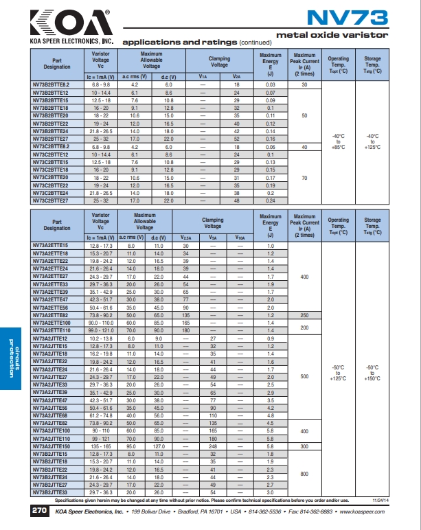 NV73 1H/1E 层叠型金属氧化物压敏电阻器
