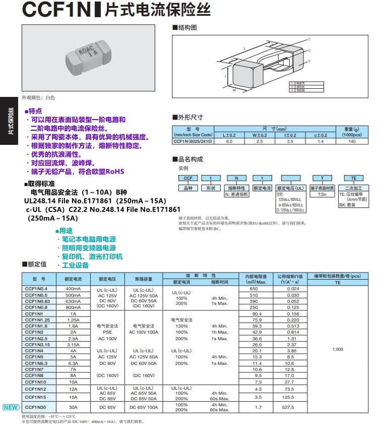 KOA电流保险丝 CCF1N2TTE 耐浪涌陶瓷贴片式熔断器 KOA代理 罗吉达
