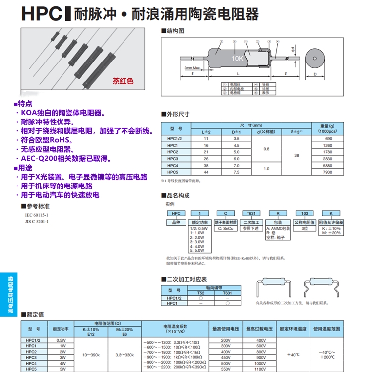 KOA耐高压电阻HPC4C272K 陶瓷耐浪涌 耐脉冲用 4W 2.7K ohm 10%