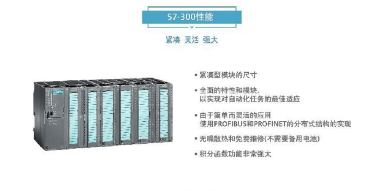 S7-300是模块化小型PLC系统,能满足中等性能要求的应用。各种单独的模块之间可进行广泛组合构成不同要求的系统。与S7-200 PLC比较,S7-300 PLC采用模块化结构,具备高速(0.6~0.1μs)的指令运算速度;用浮点数运算比较有效地实现了更为复杂的算术运算;一个带标准用户接口的软件工具方便用户给所有模块进行参数赋值;方便的人机界面服务已经集成在S7-300操作系统内,人机对话的编程要求大大减少。SIMATIC人机界面(HMI)从S7-300中取得数据,S7-300按用户的刷新速度传送这些数据。S7-300操作系统自动地处理数据的传送;CPU的智能化的诊断系统连续监控系统的功能是否正常、记录错误和特殊系统事件(例如:超时,模块更换,等等);多级口令保护可以使用户高度、有效地保护其技术机密,防止未经允许的复制和修改;S7-300 PLC设有操作方式选择开关,操作方式选择开关像钥匙一样可以拔出,当钥匙拔出时,就不能改变操作方式,这样就可防止非法删除或改写用户程序。具备强大的通信功能,S7-300 PLC可通过编程软件Step 7的用户界面提供通信组态功能,这使得组态非常容易、简单。S7-300 PLC具有多种不同的通信接口,并通过多种通信处理器来连接AS-I总线接口和工业以太网总线系统;串行通信处理器用来连接点到点的通信系统;多点接口(MPI)集成在CPU中,用于同时连接编程器、PC机、人机界面系统及其他SIMATIC S7/M7/C7等自动化控制系统。
