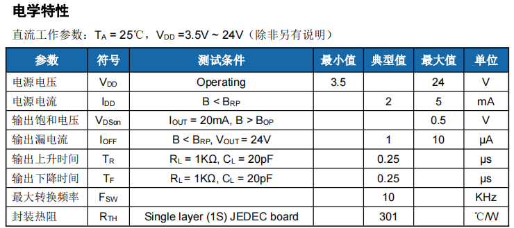HS45L的输出晶体管在面向封装标示的一面存在一定强南极或北极磁场时会被锁定在开(BOP)状态,而在无磁场时锁定在关(BRP)状态。