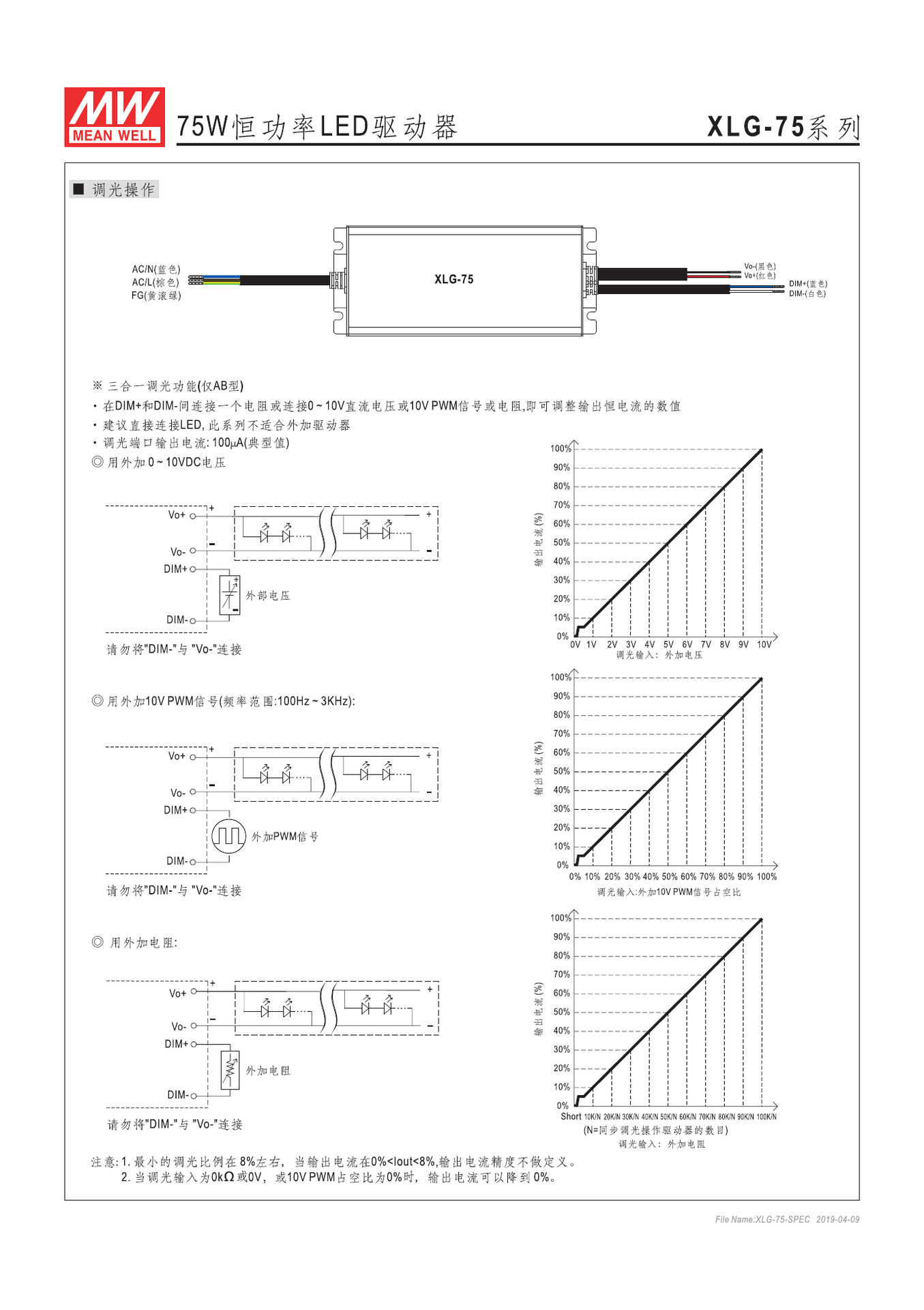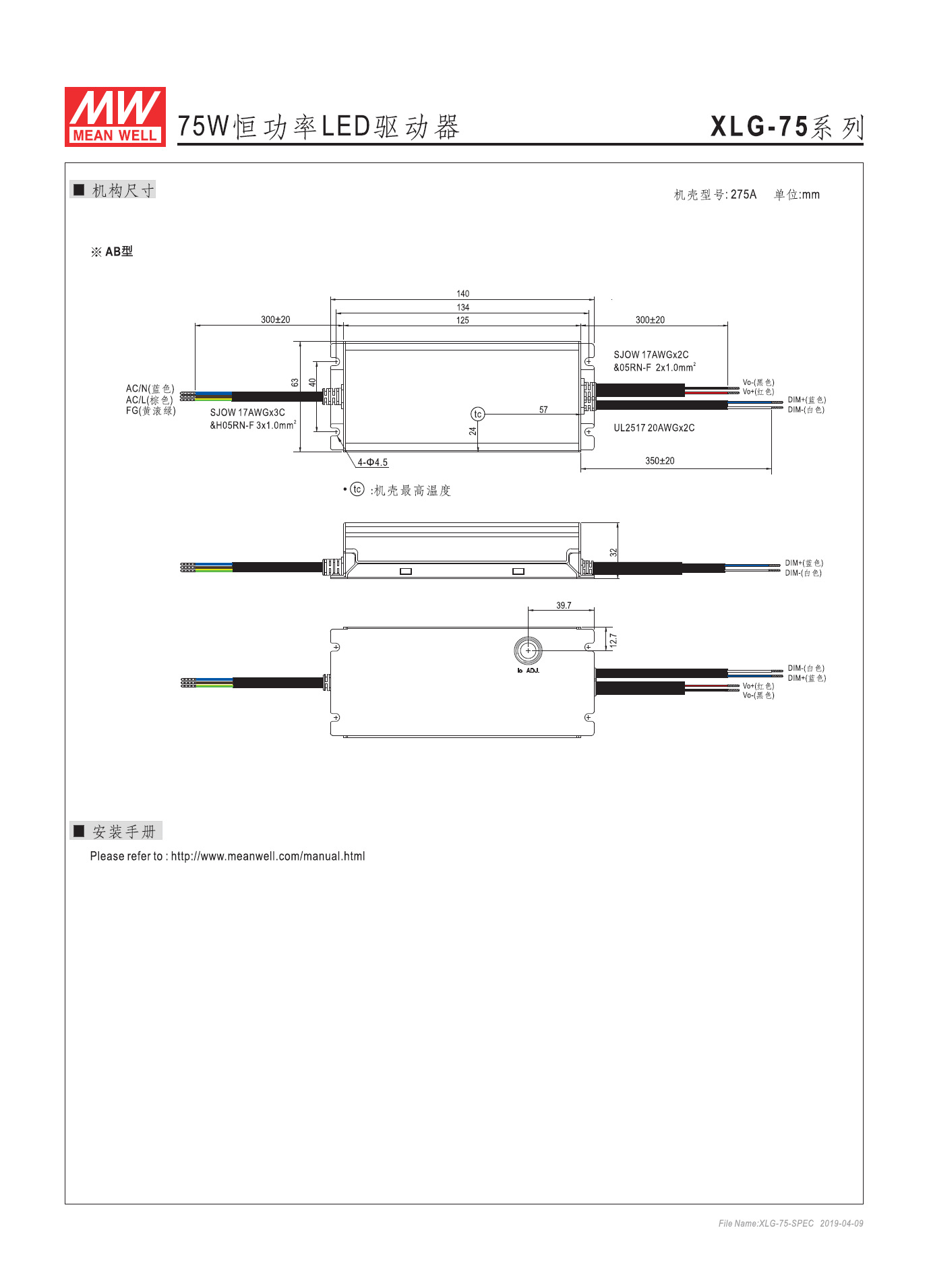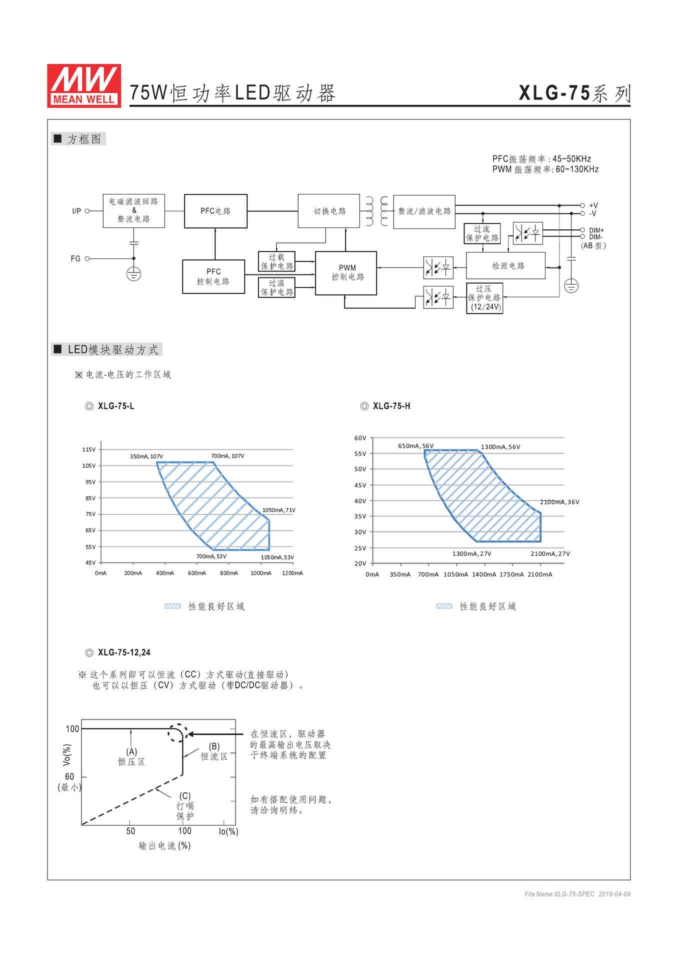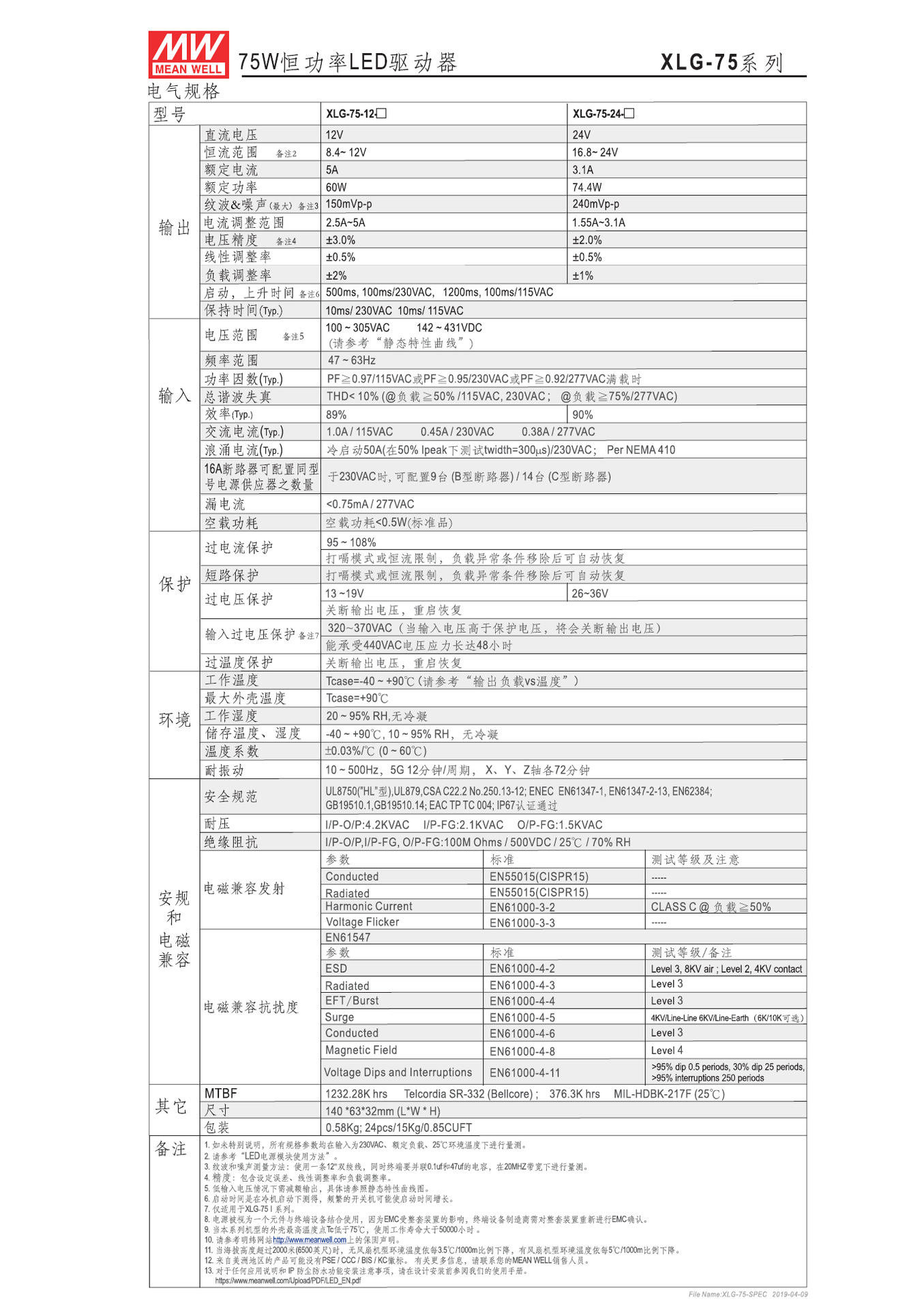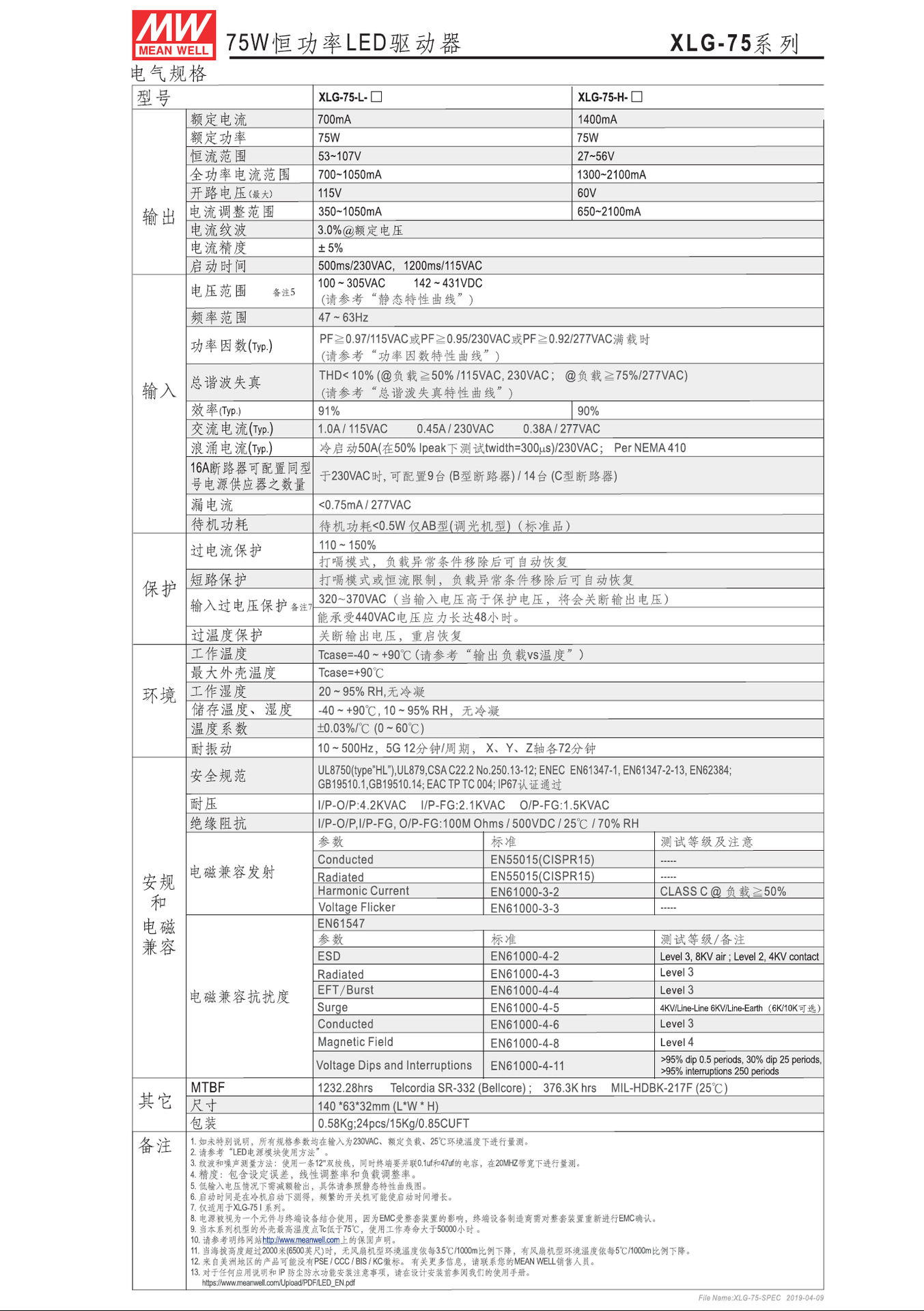 明纬XLG-75-H-A 75W1400mA恒流恒压可全功率输出LED驱动器开关电源