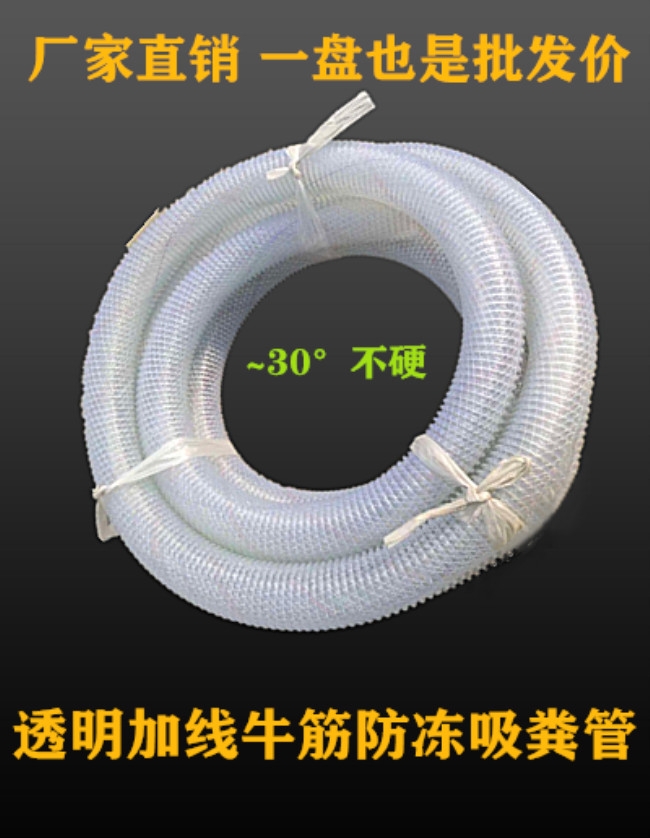 材质;pvc树脂螺旋管为透明无毒软管,简称牛筋管。使用温度在-30-60+,特点耐腐蚀,耐高负压,使用寿命长。不存在吸瘪,折断,拖层等现象。四季通用,抗冻  耐磨。吸粪车吸污车专用抽粪管子是按一米计算,耐温范围:-30℃+60℃