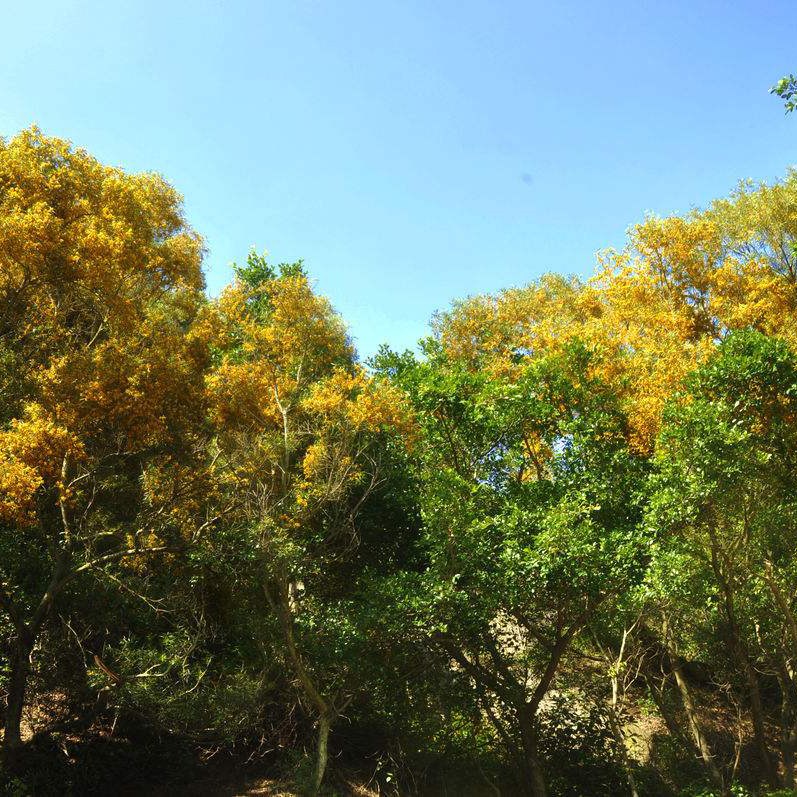 台湾相思:常绿乔木,高6-15米,枝灰色或褐色,无刺,小枝纤细。苗期一片真叶为羽状复叶,长大后小叶退化。头状花序球形,单生或2-3个簇生于叶腋,直径约1厘米;总花梗纤弱,长8-10毫米;花金黄色,有微香;花瓣淡绿色,长约2毫米。荚果扁平,干时深褐色,有光泽;种子2-8颗,椭圆形,压扁,长5-7毫米。花期3-10月;果期8-12月。