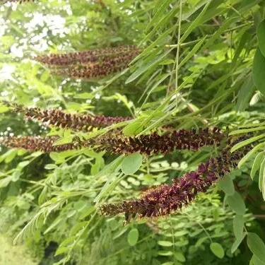 紫穗槐,豆科紫穗槐属,落叶灌木。高1-4m,丛生、枝叶繁密,直伸,皮暗灰色,平滑,小枝灰褐色,有凸起锈色皮孔,幼时密被柔毛;侧芽很小,常两个叠生。叶互生,奇数羽状复叶,小叶11-25,卵形,狭椭圆形,先端圆形,全缘,叶内有透明油腺点。总状花序密集顶生或要枝端腋生,花轴密生短柔毛,萼钟形,常具油腺点,旗瓣蓝紫色,翼瓣,龙骨瓣均退化。荚果弯曲短,长7-9mm、棕褐色,密被瘤状腺点,不开裂,内含1种子,种子具光泽,千粒重10g。花果期5—10月。根部有根疣可改良土壤,枝叶对烟尘有较强的吸附作用。又可用作水土保持、被覆地面和工业区绿化月常作防护林带的林木用。是黄河和长江流域的水土保持植物。枝叶作绿肥;枝条用以编筐;果实含芳香油,种子含油10%。 叶含紫穗槐甙(是黄酮甙,水解后产生芹菜素);根与茎含紫穗槐甙、糖类;