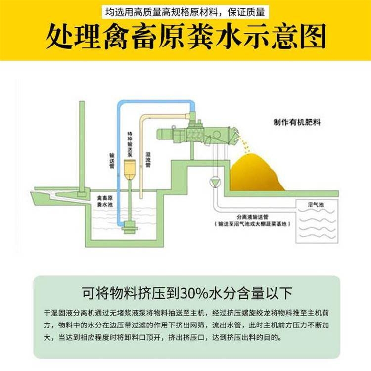 用设备配套的无堵塞液下泵将牛粪/猪粪水抽送至固液分离机内,再由绞龙将粪便水逐渐推向机器的前方,同时不断提高机器前缘的压力,迫使物料中的水分在边压带滤的作用下挤出网筛,流出排水管。