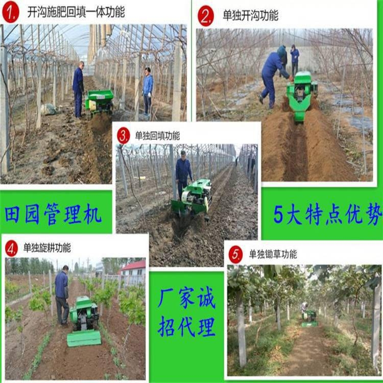 本机主要有五大功能:开沟施肥自动回填一次性完成(化肥)、单独开沟施土杂肥、单独除草、更换回填和旋耕装置后可进行回填和旋耕作业,该机体积小,操作灵便,适用于果园葡萄、果树、枸杞、蓝莓等经济作物的开沟施肥作业。