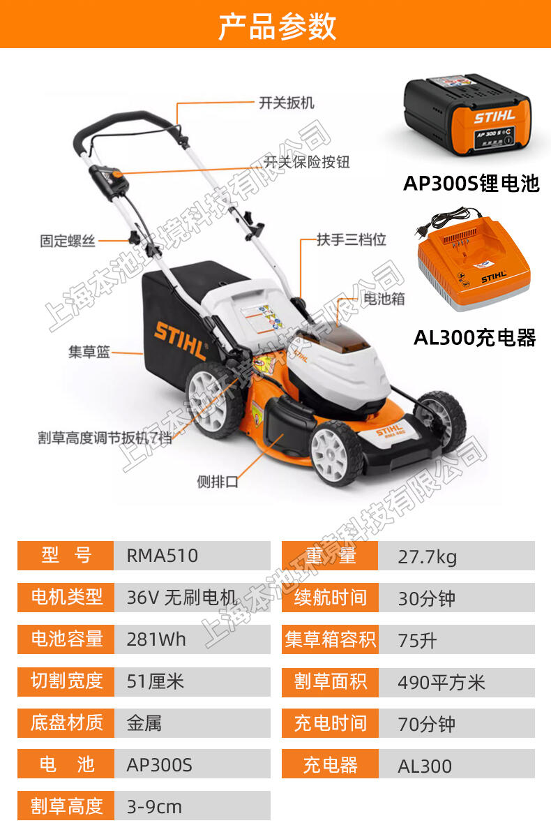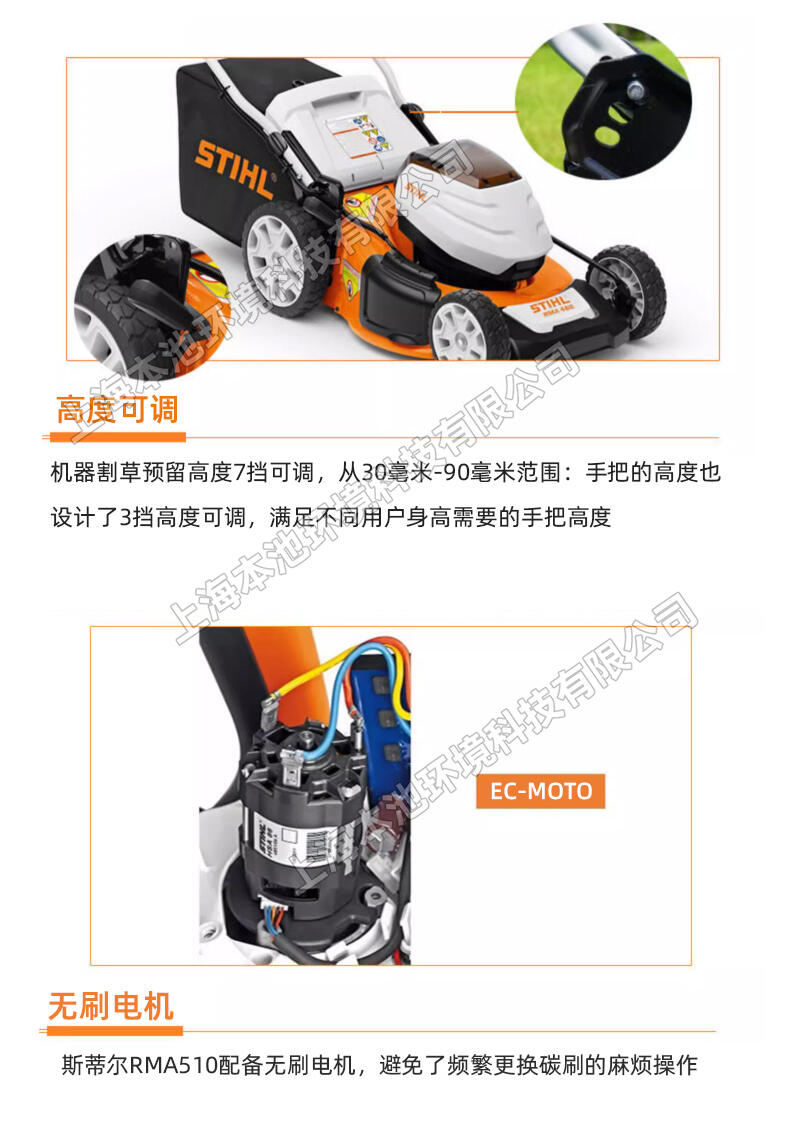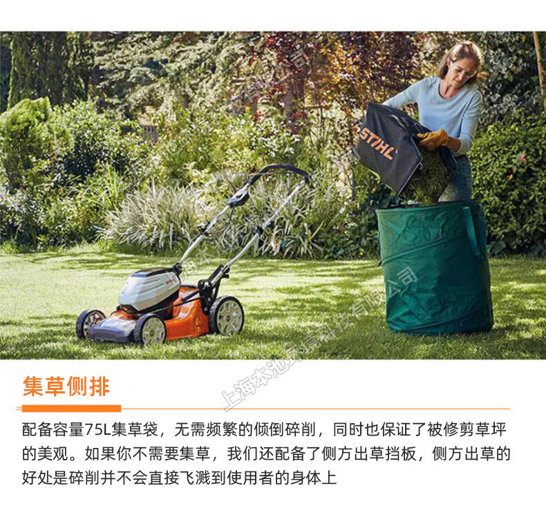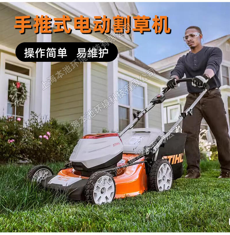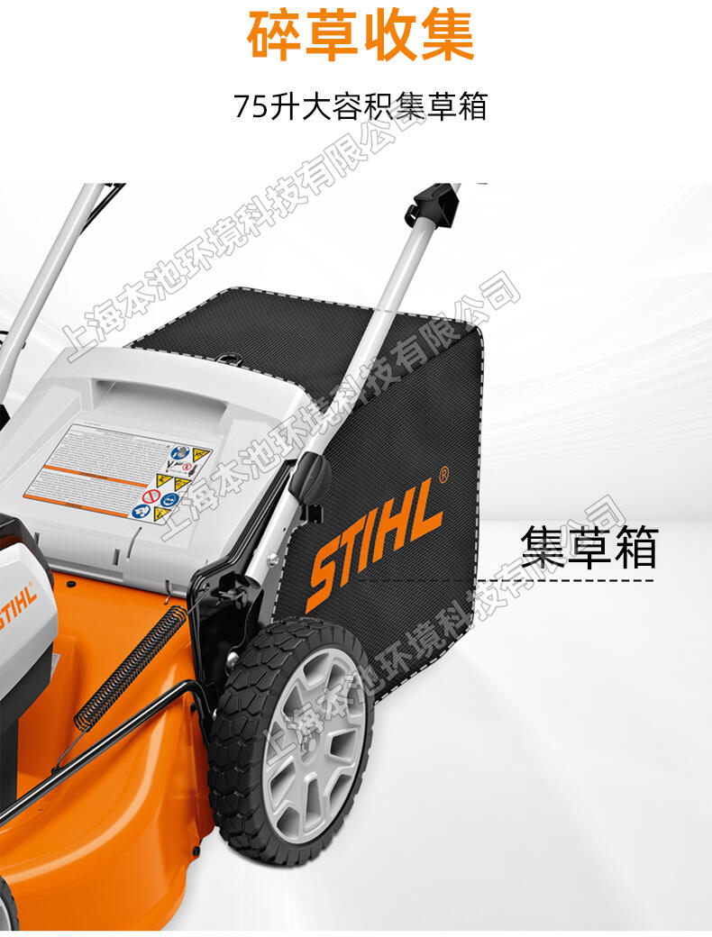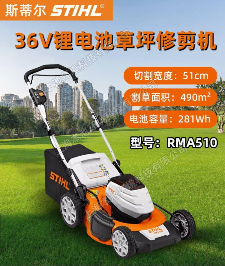 STIHL斯蒂尔RMA510电动草坪机,36V锂电池草坪修剪机,手推式电动割草机,操作简单,易维护。可同时安装两个电池,续航时间久。75L大容量集草箱。简单易启动,适用于多种场合,公园草坪、小区绿化、别墅草坪、农业畜牧,小面积家用等。