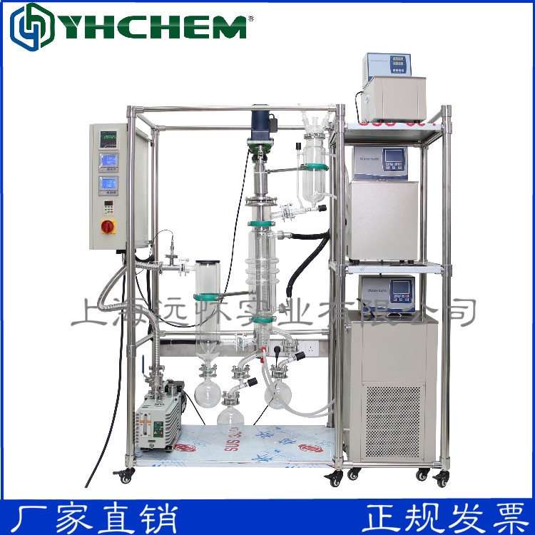 短程蒸馏器是一个工作在1~0.001mbar压力下热分离技术过程,它较低的沸腾温度,非常适合热敏性、高沸点物。其基本构成:带有加热夹套的圆柱型筒体,转子和内置冷凝器;在转子的固定架上精确装有刮膜器和防飞溅装置。内置冷凝器位于蒸发器的中心,转子在圆柱型筒体和冷凝器之间旋转。