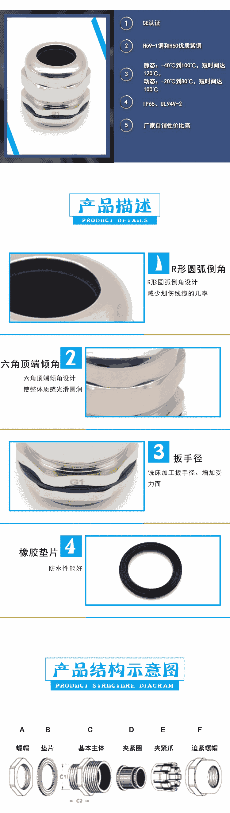 產品說明 :本公司的不锈钢电缆接头采用304不锈钢材质精制而成,具有独特的防爆功能,特殊夹紧爪与夹紧圈之设计,夹紧电缆范围大,抗拉力特强,可防水、防尘、抗盐、耐弱酸、酒精、油、油脂及一般溶剂。防爆作用广泛被使用在防爆电器,中石化,化工等行业,不锈钢电缆接头防爆认证齐全。