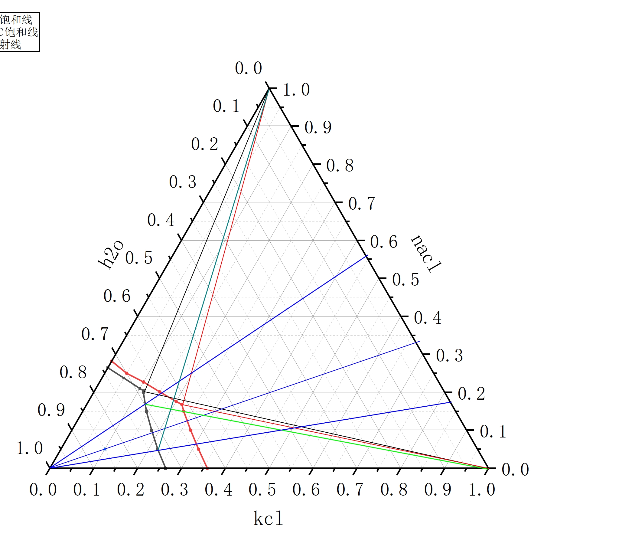 拿氯化钾与氯化钠质量分数比例2:1的情况进行模拟,图1中红色为100度混合溶液溶解度曲线,黑色为25度混合溶解度曲线,右下部分红色为三角形区域为100度纯氯化钾析出区域,右下部分黑色三角形为25度纯氯化钾析出区域。左上部分红色为三角形区域为100度纯氯化钠析出区域,左上部分黑色三角形为25度纯氯化钠析出区域。右侧部分为析出混合盐区域。